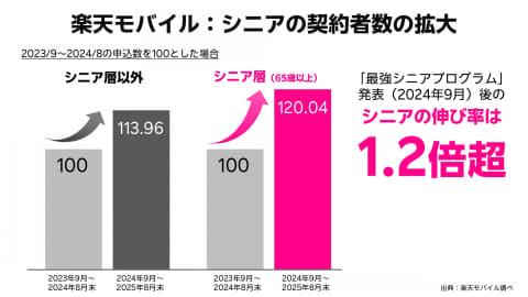 同社によれば、最強シニアプログラム発表後のシニア契約者数の伸び率は、発表前と比べて1.2倍以上に増加したという。あわせて6月からは、65歳以上のユーザーを対象に、「Rakuten 最強プラン」が実質1年間無料、オプションパックも実質6カ月無料で利用できる「敬老キャンペーン」も展開する。