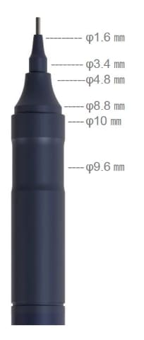 テーパー加工については、直径10mmのボディを8.8mmに削り、これを4.8mmになだらかな富士型(逆アール)加工で削り、さらに3.4mmに削り、また富士型に1.6mmに削るという、4段の加工を施している。これにより、ペンが紙面を遮ることを低減し、紙上の見通しをよくしている。
