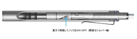 消しゴムユニットについては、ノックを制御する「ファインイレースシステム」を搭載。芯出しするときは消しゴムユニットをノックする操作となるが、消しゴムを使うときは回転により自動的にノックが停止しロック状態になる。これにより、ホルダー消しゴムのように字消しができる。仕組みは本体内のオモリがペンの回転で移動し、ノック機構を制御している。