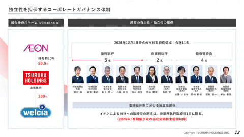 ツルハHD、ウエルシアHDおよびイオンが4月11日付で資本業務提携に係る最終契約を締結し、ツルハHDとウエルシアHDとの間で株式交換契約を締結した。これら最終契約および株式交換契約に基づき、経営統合を実現した。