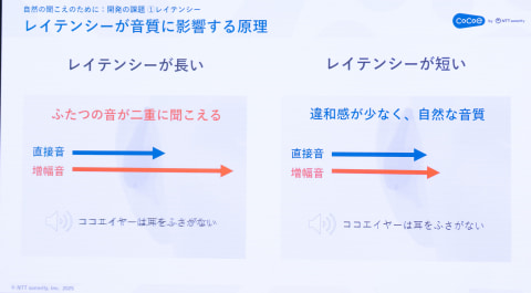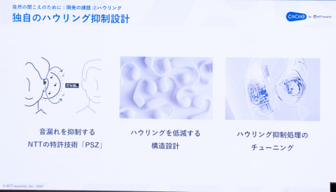cocoe Earはこうした課題に対し、NTTが開発した音響制御技術「PSZ(パーソナライズドサウンドゾーン)」を搭載。音漏れを抑制しながら、音の「打ち消し距離」を精密に制御することで特定の空間(耳元)にだけ音を閉じ込める仕組み。スピーカーから発した音がマイクに回り込むのを物理的に抑制する。ハウリングしすぎて「音が聞こえにくくなる」ことを防ぐためにソフトウェアでハウリングの誤作動を防ぐ対策もされている。