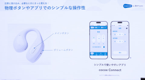 専用アプリ「cocoe Connect」(iOS/Android)も展開し、スマートフォン操作に不慣れな人でも直感的に集音モードや音量調整ができるUIを採用。必要に応じて集音機能を停止することもアプリやcocoe Earの側面ボタンを通じて行なえる。