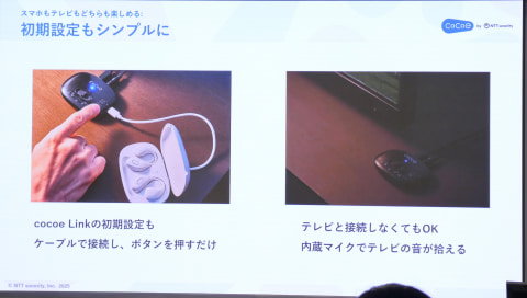 筆者も短時間ながらもcocoe Earを試した。cocoe Linkを使ったテレビ視聴(cocoe Linkとテレビをケーブル接続)を試したところ、周囲の環境音を拾いつつも、テレビの音声はしっかりとクリアに再生された。遅延も感じられず、音の定位やバランスも自然で、視聴中の会話にも違和感なく対応できる印象だ。