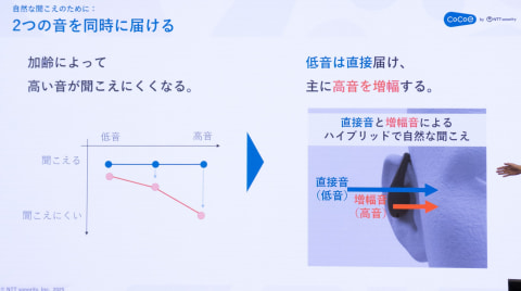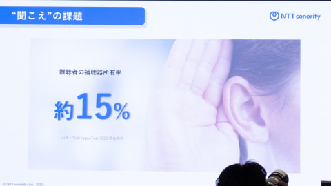 日本ではすでに1,430万人の難聴者がいると推定される一方で、補聴器保有率は15%と、欧米の50%などと比較して低い水準にとどまっている。また、日本の高齢化問題や、2050年までに25億人に達するとされる世界的な難聴人口といった社会的背景を踏まえ、NTTグループが長年培ってきた音響技術を活かしている。