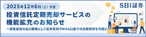 SBI証券は、12月6日から投資信託「定期売却サービス」の売却額の指定方法に「定率指定方式」と「期間指定方式」を追加する。あわせて「NISA口座での定期売却設定」を可能にする機能拡充も行なう。これにより、資産運用の“出口”戦略として定率売却やNISA口座での定期売却を可能にする。