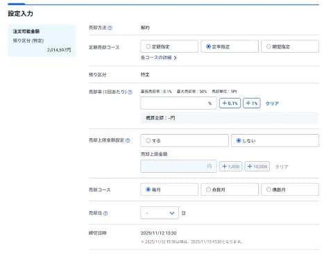 - 定額指定方式(従来):定期的に売却する1回あたりの金額を指定