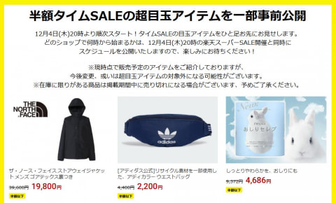 半額タイムSALEは目玉商品を先行公開していますが、どのショップで何時から始まるかは、12月4日20時の楽天スーパーSALE開催と同時にスケジュールが公開されます。