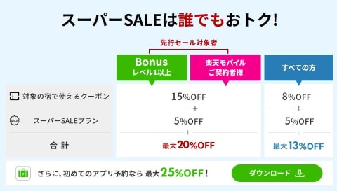 今回のセールでは、国内の宿泊施設を対象に21,000点以上のお得な宿泊プランを提供するほか、2026年9月までの海外ホテル宿泊でポイントが15%還元されるキャンペーンなども実施します。さらに、楽天モバイル契約者とBonus レベル1~4の会員は対象施設を最大20%OFFで予約できます。