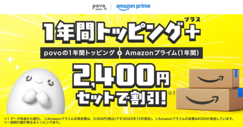 KDDIは、povo2.0の「いつものトッピング」として、大容量の1年間トッピングにAmazonプライム1年間分がセットになり、割引もされる新たなトッピング「1年間トッピング+(プラス)」の提供を開始した。