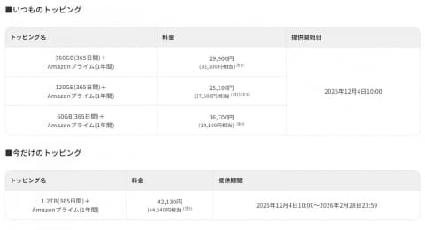 また、「今だけのトッピング」の「1.2TB(365日間)」に「Amazonプライム(1年間)」がセットになったトッピングも42,130円で用意され、2026年2月28日までの期間限定で提供される。Amazonプライムの年間会費が2,400円割引されるのは上記と同じ。