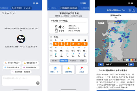 au Starlink Direct対応端末での衛星データ通信時、ウェザーニュースアプリは「衛星通信モード」に切り替わる。生成AIが天気の質問に答える「お天気エージェント」や、1kmメッシュの「現在地の天気」、雨雲レーダーなどを利用でき、アウトドア活動中のほか、いざという時の気象・防災情報として活用できる。