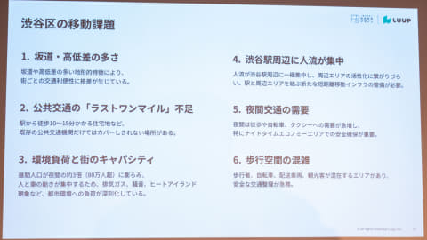 渋谷区は、鉄道などの公共交通機関が充実している一方、坂道や高低差の多さ、駅周辺への人流集中、駅から離れた生活圏におけるラストワンマイルの移動手段不足といった課題を抱えている。これらは区民の生活利便性にとどまらず、来街者の回遊性や観光、防災、夜間の安全対策など、幅広い分野に影響を及ぼしている。