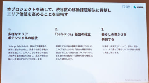 交通安全、移動支援、地域共生といった複数領域を横断し、官民連携で「安心して移動できる街」をつくることを目的としており、Luupのモビリティ技術やデータと、渋谷未来デザインが持つ地域連携の知見を組み合わせることで、渋谷区での移動の安全性と利便性の向上を図る。