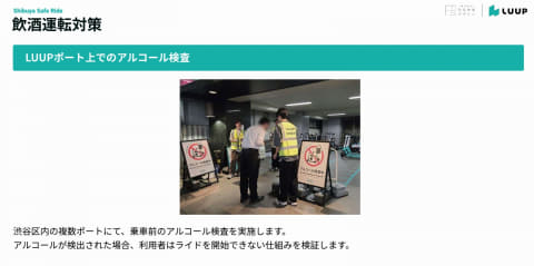 Luupは9日、安全な移動を基盤に街の移動課題を解決し、「街と人と乗り物の共生」を目指す共創型プロジェクト「Shibuya Safe Ride Project」を発足した。第一弾の取り組みとして、渋谷区内の複数ポートで乗車前のアルコール検査を行なうなど飲酒運転対策を進める。
