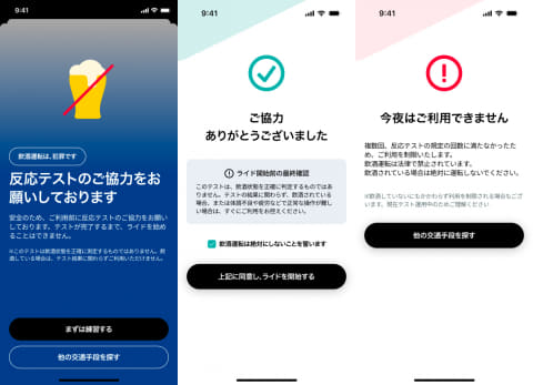 テスト結果を通じて自身の状態を確認してもらうことを目的とし、結果に関わらず、利用前には飲酒していないことを誓約する必要がある。なお、反応テストの再受験回数が規定数に達した場合、一定時間LUUPを利用できなくなる。