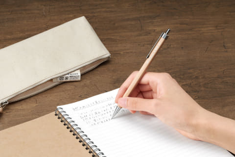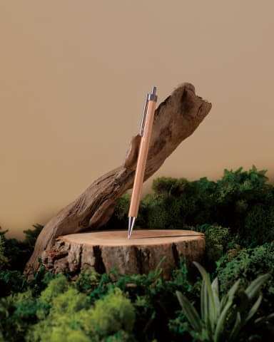 ペン先(口金)とクリップ、ノックキャップはメタル製。メタル仕上げは木肌と調和させたマットな風合とした。なお、消しゴムは付属していない。