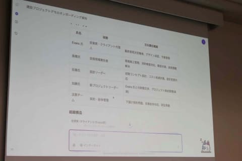 デモンストレーションでは、建設会社の複数の議事録やファイルを読み込み、中途入社の新メンバー向けの資料作成を行なった。自動生成された資料では、プロジェクトの概要から要点となる会議中の発言、社内特有の知識まで網羅しているほか、音声から発話者を聞き分け、プロジェクトメンバーの名前とポジションまでも表記されていた。