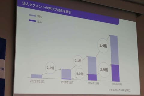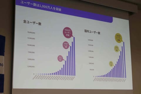 Nottaのユーザー数は現在、国内が300万人、グローバルを含めた合計が1,500万人を突破。グローバルユーザーが圧倒的に多い状況だが無料ユーザーも多く、Nottaの売上は70%が日本国内で、特に法人会員が多くを占めている。