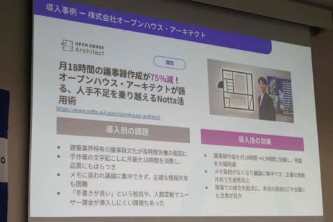 オープンハウス・アーキテクトの導入事例では、これまで建設業界特有の議事録文化により手作業の文字起こしなどに時間を割いていたが、Notta導入後は議事録作成時間が月18時間から4.5時間に削減されたほか、会議中のメモ負担がなくなり議論に集中できるといった効果が確認できたという。