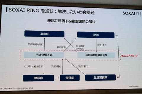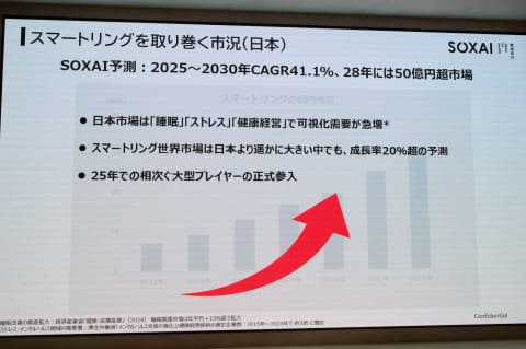 SOXAI 代表取締役社長の渡邉達彦氏は、睡眠に関する課題を解決することは、生活習慣病による医療費増大の抑制や健康寿命の増進といった、社会課題の解決につながる背景があると説明。市場規模に関しても「健康可視化需要が急増している」(渡邉氏)としたほか、大手ブランドの国内参入などでスマートリングは今後一層認知の拡大が進み、一般的な市場予測から上振れすると予想し、「日本国内のリーダーとして牽引していきたい」と意気込みを語った。海外展開についても「できるだけ早くやっていきたい」と前向きな姿勢を示した。