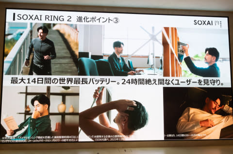バッテリー駆動時間は、前モデル「SOXAI RING 1」「SOXAI RING 1.1」では最大9日間だったところ、SOXAI RING 2は1.5倍の最大14日間に拡大した。充電時間は60〜120分間。バッテリーの種類はリチウムポリマー。