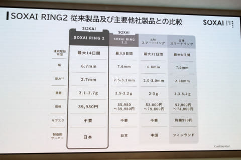 計測したデータを本体に蓄積できる期間は、SOXAI RING 2発売当初のファームウェアで4日間分とする。今後のファームウェアアップデートで、1週間程度まで蓄積できるようになる見込み。
