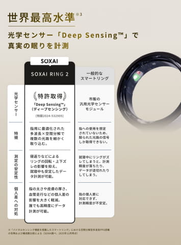 初代モデルから搭載している血中酸素レベルの検知機能は、SOXAI RING 2においてセンサーとアルゴリズムを全面的にアップデート。より微細な変化を捉える解析精度を実現した。特に睡眠時無呼吸の兆候をこれまで以上に高い精度で把握できるようになったとしている。