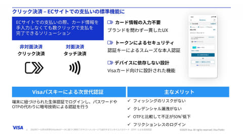 クリック決済は、ECサイトでの支払いの際、カード情報を手入力しなくても数クリックで支払いを完了できるソリューションで、こちらにもトークンが用いられる。Visaパスキーによる認証などによりセキュリティも強化でき、フィッシングのリスクがなく、クレデンシャル漏洩もない。ワンタイムパスワードに比べ、不正利用は50%低下できているという。