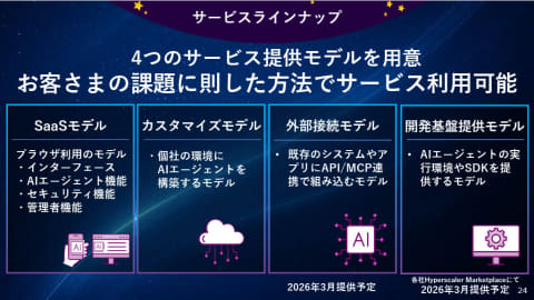 提供形態は、ブラウザーやCLI(コマンドライン)から利用できる「SaaSモデル」のほか、社内インフラ上に構築する「カスタマイズモデル」、既存業務システムとAPIやMCPで連携する「外部接続モデル」、クラウド上で実行環境やSDKを提供する「開発基盤提供モデル」の4モデルを展開。外部接続モデルと開発基盤提供モデルは、2026年3月の提供開始を予定している。