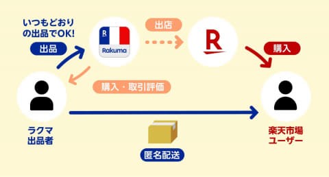 商品はラクマが選定し、ラクマでの出品と並行して楽天市場内で販売。楽天市場内での販売は、コンビニや郵便局などでラクマ利用時と同じ発送手続きで行なわれ、出品者と購入者の双方が住所などの個人情報を伏せたまま取引できる。