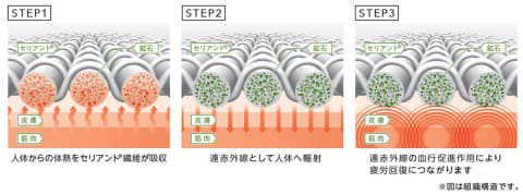 EX セリアントでは、原料配分と製造プロセスを改良することで従来品よりセリアント素材の効果を高め、遠赤外線の血行促進作用により疲労回復効果が期待できるという。仕組みとしては、人体からの体熱をセリアント繊維が吸収し、遠赤外線として人体へ輻射。遠赤外線の血行促進作用により疲労回復につなげる。
