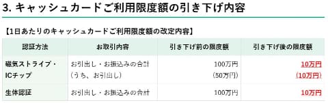限度額については、従来は磁気ストラップ・ICチップによる引き出し・振込みの合計は1日100万円(うち引出しは50万円)まで、生体認証では100万円が上限だったがいずれも限度額は10万円となる。