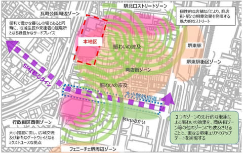 特に堺東駅周辺は、大阪府、大阪市、堺市が一体となって策定した大阪のまちづくりグランドデザインにおいて、夢洲・咲洲エリア、関空・りんくう周辺エリア、大阪都心部と一体となって大阪の成長・発展をけん引するエリアとされている。