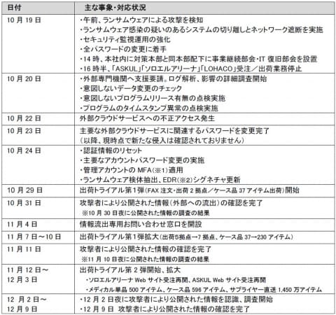 10月19日に、アスクルのサービスにランサムウェア攻撃が行なわれ、データの暗号化とシステム障害により、大規模なサービス停止と保有情報の流出が発生。アスクルの関連サービスは一部再開しているものの、現在もLOHACO等のサービスは停止している。