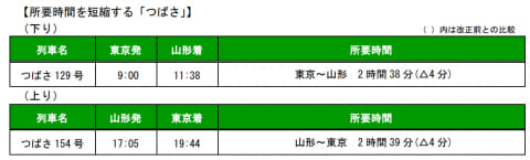 東北・山形新幹線「つばさ」は、車両がE8系に統一されることから、一部列車で宇都宮~福島間の最高速度を時速275kmから時速300kmに向上。目的地への到着時間を4分短縮する。対象は東京駅9時発の「つばさ129号」と山形駅17時5分発の「つばさ154号」。