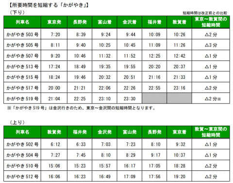北陸新幹線「かがやき」についても所要時間を短縮。所要時間は従来から1分~3分の短縮で、東京~福井間が最速で2時間49分、東京~敦賀間が最速で3時間6分となる。