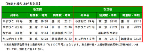 東京駅20時20分発の「やまびこ69号」は東京駅20時8分発、同21時44分発の「やまびこ223号」は、同21時24分発、同22時28分発「たにがわ417号」は同22時12分発へとそれぞれ繰上げされる。また、東京駅22時44分発「なすの281号」は運転取りやめとなり、東京駅発那須塩原行き最終列車は22時16分発の「なすの279号」となる。