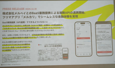 メルペイとみんなの銀行は、12月18日からフリマアプリ「メルカリ」上で銀行サービス「メルカリバンク」の提供を開始した。みんなの銀行とのBaaS(Banking as a Service)連携により、メルカリアプリ内で銀行口座の開設や即時送金、ATM出金が可能となる。