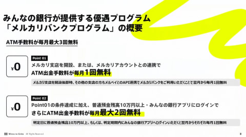 ATM出金にも対応しており、セブン銀行ATMを使った現金引き出しは毎月1回まで手数料無料。さらに、一定条件(普通預金残高10万円以上、みんなの銀行アプリへの月1回以上のログイン)を満たすことで、最大3回まで無料枠が拡大される。メルカリの「出金」が手数料が無くなるという点もメリットとしている。
