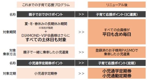 これまで東武鉄道では、夏・冬・春の長期休み等の期間限定で、親子で一緒に乗車した場合に限り小児運賃相当額のポイントを還元する「親子でおでかけポイント」と、小児通学定期券をポイント還元する「小児通学定期券ポイント」を実施していた。