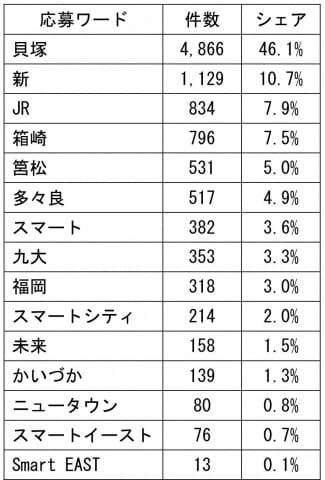 上位3案が「貝塚」「JR貝塚」「新貝塚」といずれもそのエリアの名称である「貝塚」を含んだ応募で、利用者にとって分かりやすく親しみやすい駅名として選定した。なお、新駅が設置される近隣には、福岡市地下鉄 箱崎線の「貝塚」駅がある。