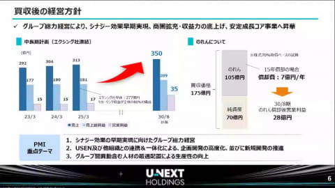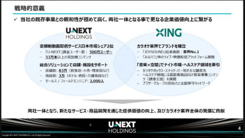 一方、エクシング/JOYSOUNDは、ナイトエコノミー市場における強い顧客基盤を持っているため、ここにU-NEXT HDの音楽配信や通信、電力、キャッシュレス決済をあわせて拡販(クロスセル)するといった展開もある。連結子会社化の理由については、「シナジーが高いということに尽きる。垂直統合で一体化し、さらなる成長が見込める」とした。