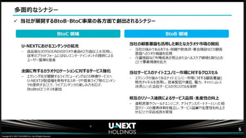 U-NEXT HDでは店舗BGMなどの音楽配信や、POSレジや決済事業、医療機関やホテル向けソリューションなどを幅広く手がけている。こうした領域においてJOYSOUNDの通信カラオケ機器を拡販するなどの展開を見込む。