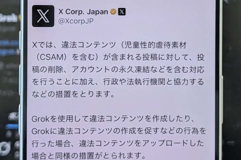 Xは、Grokによる違法コンテンツ作成について注意喚起を行なっている。特に、児童性的虐待素材(CSAM)が含まれる投稿に対して、投稿の削除だけでなく、アカウントの永久凍結などを含む対応を行なうほか、行政や法執行機関と協力するなどの措置をとるとしている。