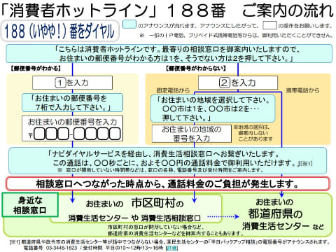 万が一トラブルに巻き込まれた場合は、消費者ホットライン「188(いやや)!」への相談を推奨しています。消費者ホットラインは最寄りの消費生活センター等を案内する全国共通の電話番号で、アナウンスに従って自宅の郵便番号を入力すると地域の消費生活センターなどが案内されます。一番はトラブルに巻き込まれないことですが、万が一のときはこうした相談窓口も利用してみましょう。