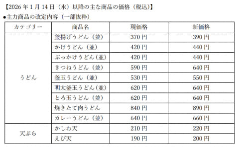 うどんについては、製品毎に20円~50円の値上げ、天ぷらやおむすびなどのご飯ものに関しては一律10円値上げされる。例として、釜揚げうどん(並)は370円から390円へ20円の値上げ、きつねうどん(並)は590円から640円へ50円値上げとなる。うどんの並から大サイズの変更は従来の180円から190円へ10円値上げされる。