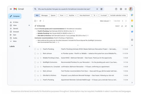 また、受信トレイに質問すると、Geminiが回答を含むシンプルなAI概要を生成。キーワードを探したり1年分のメールを掘り下げたりする代わりに、「昨年バスルーム改修の見積もりをくれた配管工は誰でしたか?」といった質問を行なうだけで、Geminiの推論機能により回答を抽出し、必要な詳細を瞬時に要約する。