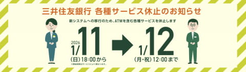 三井住友銀行は、新システムへの移行のため、1月11日~12日にかけて、ATMを含む各種のサービスを休止する。事前に入出金や電子マネーへのチャージなどを行なうよう案内している。
