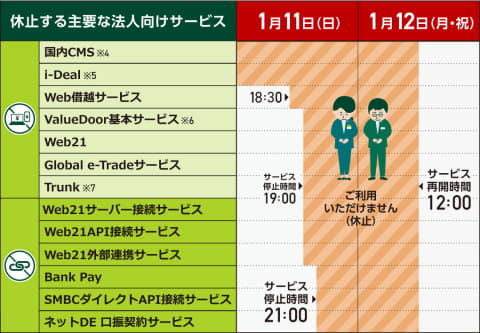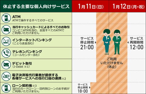 サービス休止期間は、1月11日(日曜日)の21時から1月12日(月曜日、祝日)の12時まで。ローン契約機については11日18時から休止する。作業の状況により、2月22日と23日にも同様にサービスを休止する可能性があるとしている。