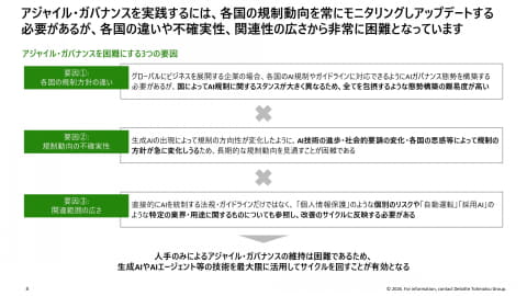 近年、AIによる事故や倫理的問題などのリスクが顕在化しており、AIガバナンスの重要性が増している。EUのAI規制法や日本のAI新法など、各国・地域で制度整備が進む一方、規制の複雑さや曖昧さ、変化の速さにより、現場での実装や体制構築が難しくなっているという。
